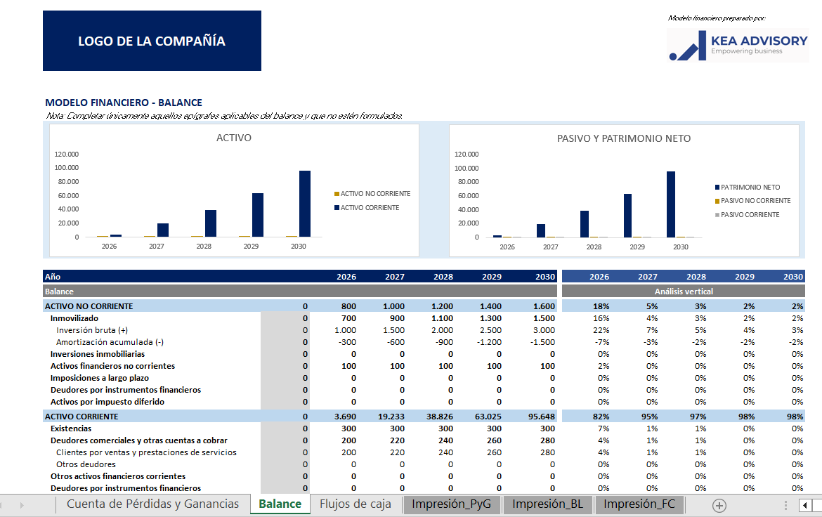 • pestañas preparadas para impresión (cuenta de resultados, balance y flujos de caja).