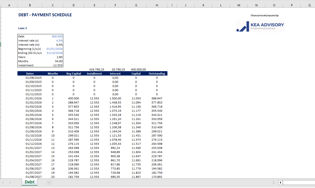 The tool includes a monthly debt amortization table where you can select the principal, the annual interest rate, and the start and end dates of the debt. The amortization schedule, including all payments, will be automatically calculated for the entire period on a monthly basis.