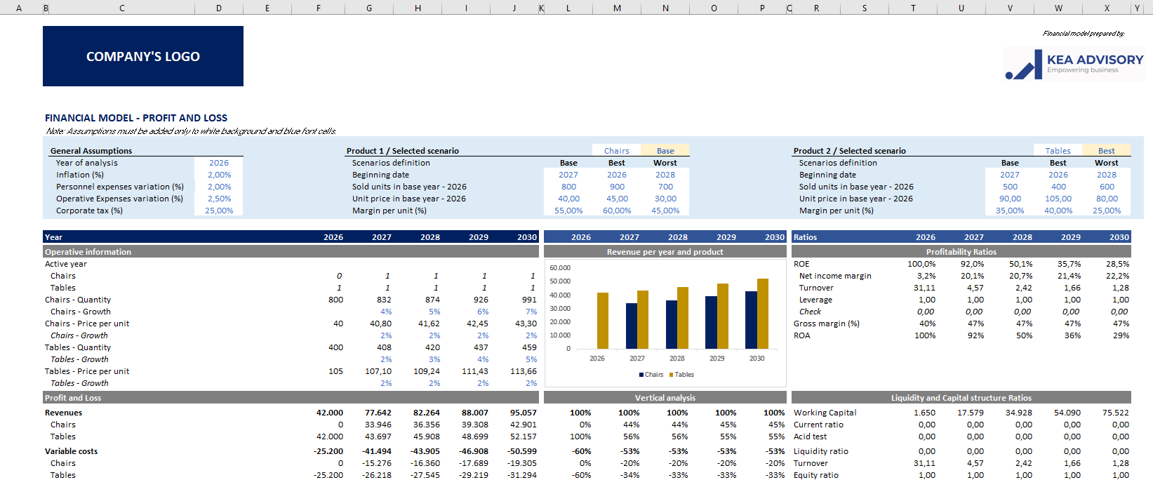 • 2 product types (ability to change quantities, prices, and their respective increases, start years),